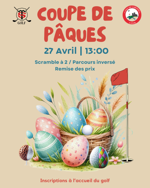 09 avril 2025 Coupe de Pâques Le Golf de Garonne organise une compétition en scramble à 2 parcours a l'envers le dimanche 27 avril à partir de 13h00. Inscriptions et renseignements à l'accueil du Golf !