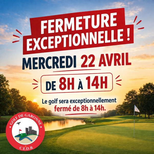 17 avril 2026 Le Golf de Garonne sera fermé le mercredi 22 avril de 8h à 14h. Merci de votre compréhension et à très vite sur les greens ⛳️ #golf #golfdegaronne #fermetureexceptionnelle #golfclub #instagolf