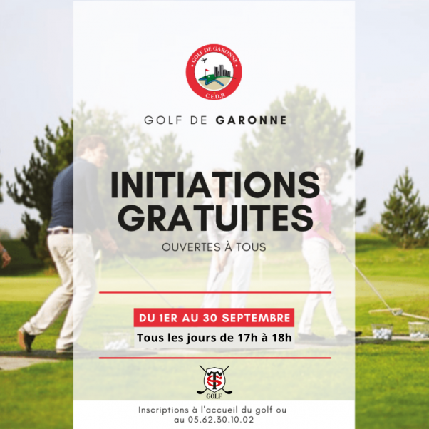 22 août 2022 Le Golf de Garonne organise des initiations gratuites en septembre, Tous les jours de 17h à 18h, venez découvrir le Golf accompagné d'un enseignant !!! Renseignements et inscriptions à l'accueil